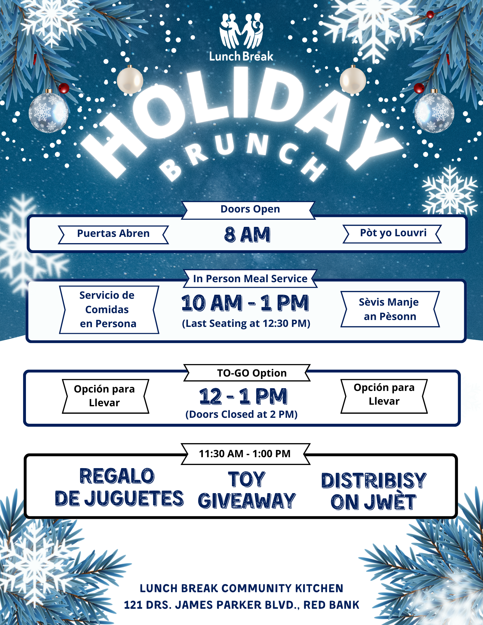 Enjoy festive flavors and traditional sides, surrounded by good company and community spirit. Quick grab-and-go selections are available. We’ll also be giving toys to the kids. At Lunch Break, our commitment is to create a warm and unforgettable holiday gathering for everyone. Mark your calendars for this special occasion!